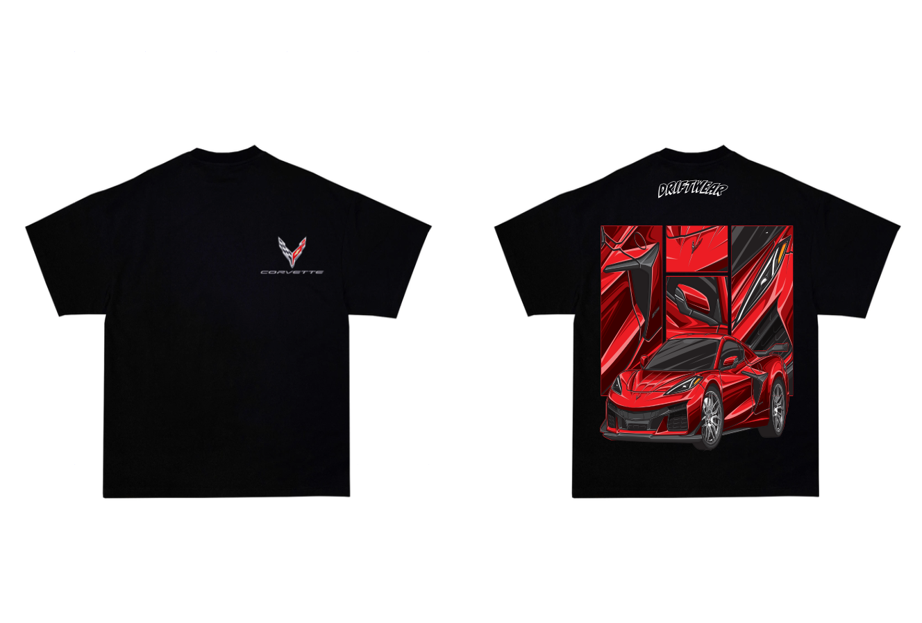 DRIFTWEAR IS CLOTHING DESIGNED FOR TRUE CAR LOVERS. OUR HIGH-QUALITY, STYLISH PIECES CELEBRATE THE THRILL OF THE OPEN ROAD AND THE PASSION FOR AUTOMOTIVE PERFORMANCE. CUSTOM-FIT COTTON SHIRT SHORT SLEEVE TEE-SHIRT WITH DRIFTWEAR CORVETTE GRAPHICS PRINTED AT FRONT AND BACK.